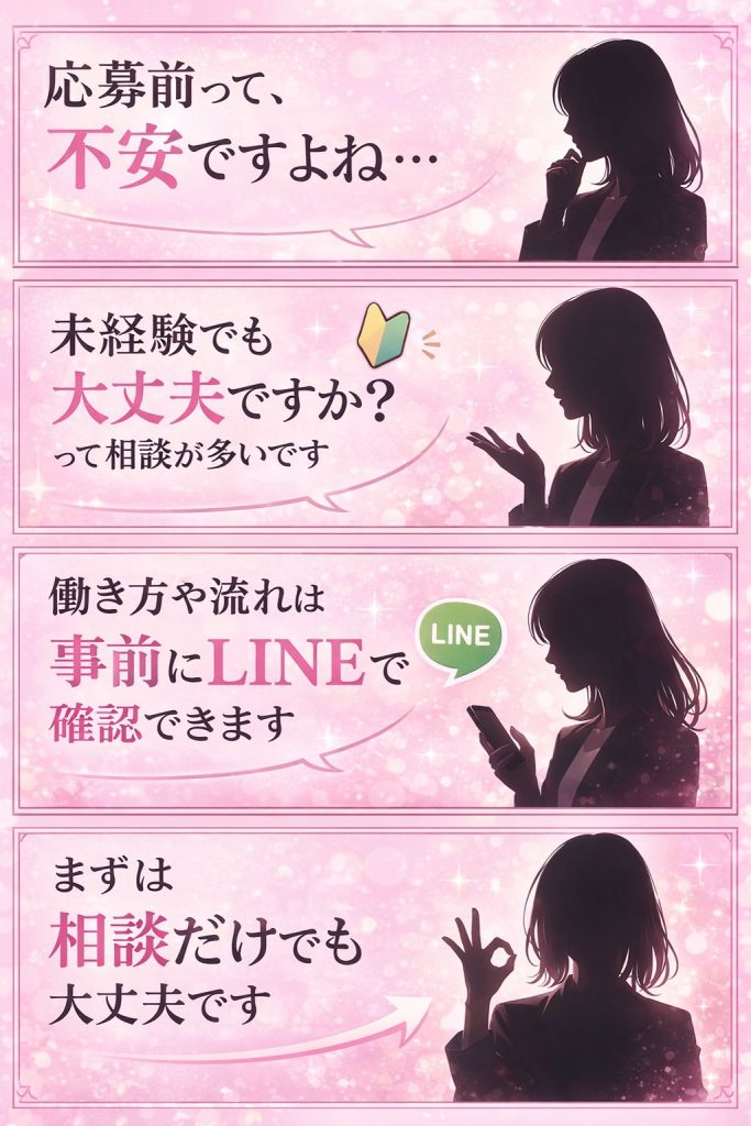 ※ご案内内容や確認事項は状況により異なる場合があります。まずは求人LINEから、希望エリア・希望時間帯・NG・配慮したい点をご相談ください。